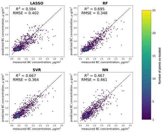 RF has the best performance among all the models, with the highest R2 and lowest RMSE over the validation set. The scatter plots comparing model predicted values against measured values in the validation set are shown in Figure 4. All the models do not show significant bias in their predictions. The LASSO and NN models show more outliers and are more scattered than SVR and RF models, which are consistent with their R2 and RMSE performance. All four models have more outliers below the 1:1 line, suggesting they fail to capture some hyperlocal hotspots fully.