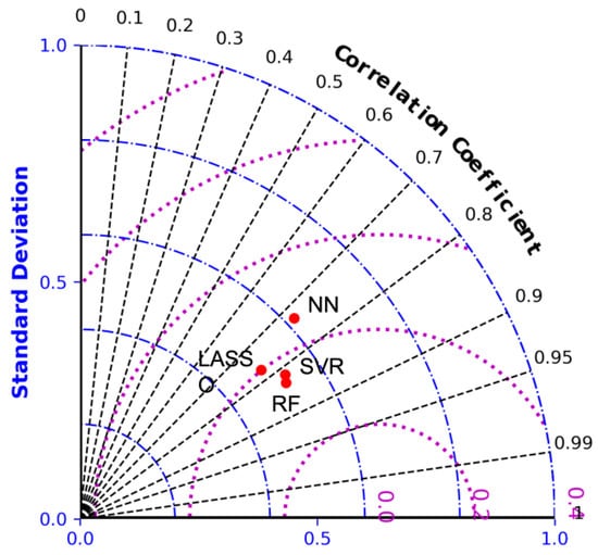 Figure 5 shows the Taylor diagram to compare the prediction performance of all four models. The Taylor diagram is a common method used to compare different models or datasets to reproduce observed data. The diagram consists of a polar plot, where each model is represented as a point in the figure. The Taylor diagram is based on statistical measurements including correlation, standard deviation, and root mean square difference. From the figure, RF performs best, while SVR achieves similar performance, and both are better than LASSO and NN.