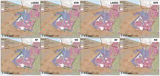 Spatial distribution of the outliers of each model over the land use types within the study domain (green dots are points less than the 10th percentile, while red dots are points greater than the 90th percentile).