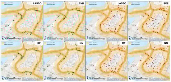 The truck route has been identified as a significant variable in BC predictions [,,]. Figure 8 shows the spatial relationship between designated truck routes and the outliers for all the models. Like local highway systems, most underestimated outliers are located within a 100 m distance from truck routes, and all the underestimated outliers are located within a 500 m distance from truck routes. The overestimated outliers are more spatially scattered, and their distributions are not influenced by truck routes.