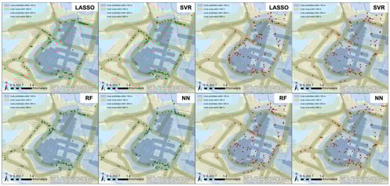 Spatial distribution of outliers of each model over the local truck routes (green dots are points less than the 10th percentile, while red dots are points greater than the 90th percentile).