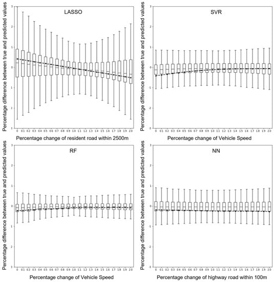 The one-factor-at-a-time (OAT) method is utilized to analyze the relative importance of input features in influencing the models’ performance. As the name suggests, the OAT method perturbs one feature at a time from 0% to 200% with a 10% increment, while keeping the rest constant. The deviation of model predicted BC concentrations from the observed measurements is then determined. The most sensitivity features of all the models are plotted in Figure 9, which also illustrates how the varying input features influence BC concentration predictions. For SVR, RF, and NN models, the vehicle speed is highly sensitive in influencing the models’ performance; it is the most sensitive feature in both SVR and RF. The total length of the residential roads with the 2500 m distance and the total length of the highway with the 100 m distance is the most sensitive feature for LASSO and NN, respectively. Variables about local road networks including highways, arterials, and residential roads are dominant for the top five features that are highly influential to the models’ performance. Figure S2 lists detailed information about the top five most sensitive features of each model.