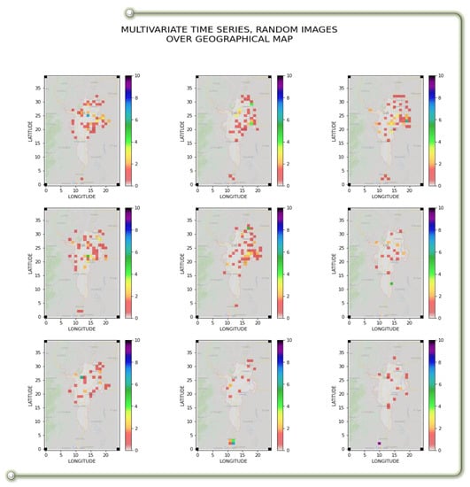 To achieve this goal, it is initially necessary to determine the spatial dependency between the locations of the events and the temporal dependency among them. This maximizes the likelihood of the provided forecasts. Therefore, efforts that might be useful in terms of the stated needs include: the geo-visualization of forecasts based on spatial clustering to reflect the characteristics of adjacent terrains [,,,,]; forecast geo-visualization for sparse data [,,,]; the geo-visualization of the forecasting of criminal activities using machine learning and deep learning techniques [,,,,,,,]; event forecasting using classical, improved classical, machine learning, and deep learning techniques for multivariate time series [,,,,,,,,,,,,,,,,]; and, finally, multivariate time series forecasting with sparse data [,,,,].