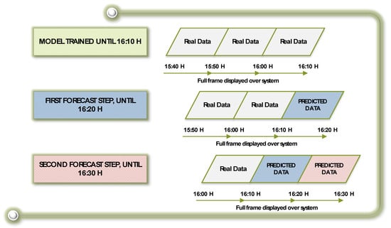 According to the example, if the model were trained using the observations made up to 16:10 h, then it would start its forecast operation with the first step showing the observations made up to 16:20 h, and the second forecast step would show the observations made up to 16:30 h. These forecasts would be geo-visualized by commanders and analysts on the geographic map of the observation zone. However, time goes on and the real-time system continues to collect data from actual events within that first time interval of the first forecast step (between 16:10 h and 16:20 h). Therefore, once 16:20 h is reached, the real-time system has the events up to that moment and can store them in the database of the tool (thus increasing it). Therefore, the model can be retrained with these data, and two forecast steps are generated with the new actual data added.