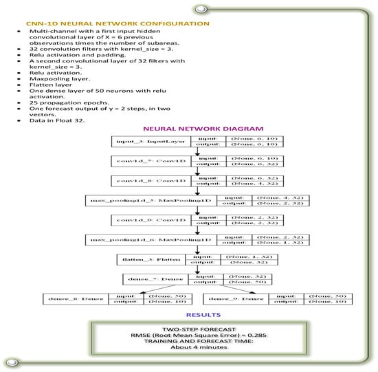 The multivariate time series does not have exogenous variables, only endogenous ones; that is, for each univariate time series that makes up the multivariate series, forecasts are required. In addition, it is a high-frequency multivariate time series, since the frequency of the series is 10 min. Additionally, it is multi-parallel, because the forecast of a step (or period), is equivalent to the forecast of a step of the value of the densities of the events in each one of the sub-areas (quadrants) of the observation area, in multi-parallel. This means that the time series is not only multivariate but also multi-parallel. It is then stated that the prediction time horizon or one-step forecast, with which this tool is designed, is 10 min (see Figure 5).