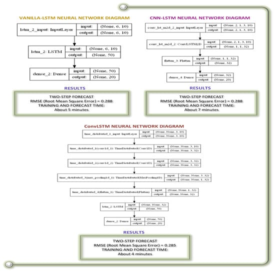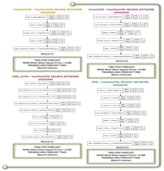 VARMA (vector autoregressive moving average) and VMA (vector moving average) models: when performing simple initial tests on these two models (of order 1), the VARMA and VMA models were discarded since, when trained and when forecasts were requested, their convergence took a long time and its error metric did not improve on that of the reference model. It should be recalled that the time convergence between the training and the generation of forecasts of two time steps is required to be a maximum of 10 min so that the system can work properly in the real-time systems of the PONAL, in this case.