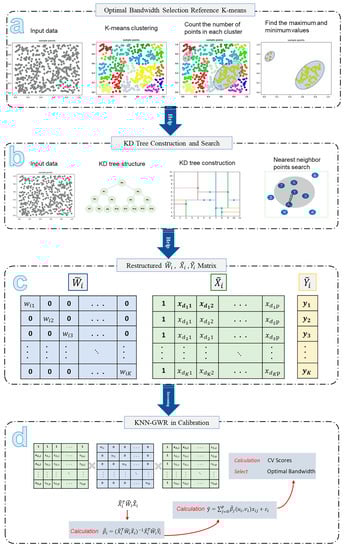 Flow chart of K-nearest neighbor geographically weighted regression. (a) Optimal bandwidth selection reference k-means. (b) KD Tree construction and search. (c) Restructured , , . (d) KNN-GWR in calibration.