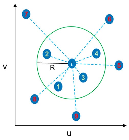 A K-dimensional tree (KD tree) built based on distance is an extended version of a binary tree for speeding up the dataset search. If the points include the dimension, they are first sorted according to the value of a dimension, such as u. Then, the middle point is selected as the split (parent) node, and all points are divided into two parts according to the coordinates on the u axis. The u value of the left subspace is smaller than that of the parent node, and the u value of the right subspace must be greater than or equal to the u value of the parent node. This process continues repeatedly until both subregions have no sample points (the terminating node is a leaf node), and finally, the region division of the KD tree is formed. Using this approach, sample points are saved on the appropriate nodes. In this case, the time complexity for performing a perimeter point lookup is . After the tree structure is established, this algorithm starts from the root node and recursively searches the left and right child nodes to find all points within the radial range of the regression point. The lookup of the observation points around the regression point was completed quickly after the KD tree was constructed, which accelerated the process of reconstructing the matrix in the KNN-GWR method.