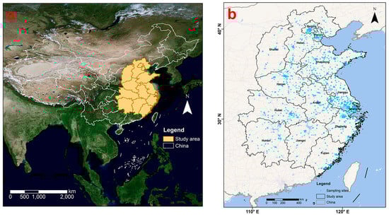 Study area. (a) Geographical location of each province of the study area in China. (b) Distribution of house price dataset in the study area.