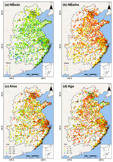 The results indicate that Area is positively correlated with residential land price, and the larger the residential area, the higher the residential land price (Figure 8c). And it seems reasonable that the effects of age are greater in Beijing–Tianjin–Hebei and the Yangtze River Delta. As these cities are better developed, housing construction has slowed down in recent years, resulting in higher house prices in some areas. In addition, the number of bathrooms is negatively correlated with house prices in some coastal cities, possibly because higher housing prices have dampened the greater demand for the number of bathrooms.