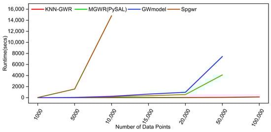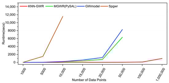 Due to the transformation of a large matrix into a small matrix, the regression efficiency of KNN-GWR is significantly improved compared with that of GWR. As shown in Figure 6 and Table 4, the average running times of KNN-GWR at 1000, 5000, and 50,000 points are 0.34, 3.59, and 31.77 s, respectively. However, the average running time of MGWR(PySAL) increased from 3.71 s at 1000 points to 178.52 s at 10,000 points, and then reached 6327.91 s at 50,000 points. Figure 7 showed the comparison of KNN-GWR with other GWR packages in terms of runtime increase ratio. The results indicated that for 10,000 observations, KNN-GWR was approximately 49.7 times faster than MGWR(PySAL), approximately 58.9 times faster than GWmodel, and approximately 3224.2 times faster than Spgwr. Spgwr cannot obtain the results because the data are larger than 10,000 observations. In addition, when the data increased to 50,000 observations, KNN-GWR was approximately 199.2 times faster than MGWR(PySAL) and approximately 260.7 times faster than GWmodel. KNN-GWR implements calibration operations at amounts of data greater than 50,000, whereas in other GWR packages memory bottlenecks are caused by storing redundant computations.