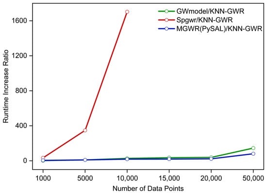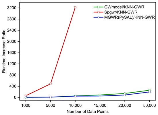 Comparison of KNN-GWR with other GWR packages in terms of runtime increase ratio (tested using house price dataset in China).