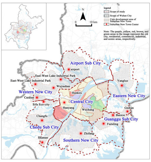 The Wuhan Urban Development Zone (Figure 1) is selected as the research area, with a total area of 3271.5 km2. According to the Wuhan Urban Master Plan (2010–2020), the urban spatial structure of 1 main city (central city), 3 sub-cities, and 3 new city groups have been formed in the central and suburban areas of Wuhan, the growth of suburban new towns has a certain foundation.