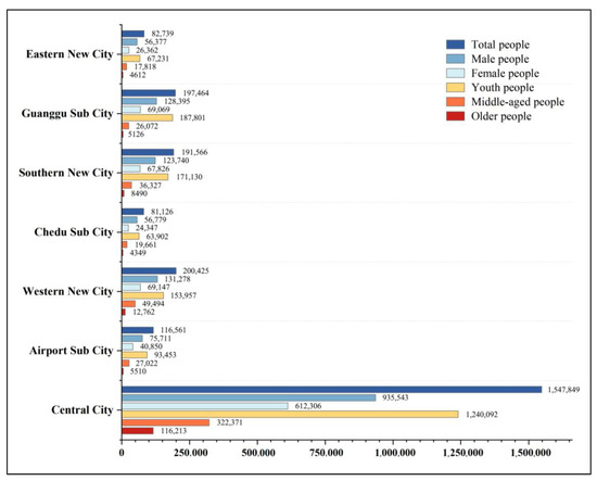The statistics of the number of ride-hailing users obtained by apps’ names are shown in Table 1. Due to the existence of multiple apps used by one user, we conducted the same user identification work before conducting the analysis and eliminated the invalid usage duration data of each App when using (invalid usage duration refers to the time data during which a user uses a mobile App without generating data traffic, as well as data with a total usage duration of less than 1000 s for that month), which will result in a small number of users. Finally, a total of 114,965 valid users who frequently use ride-hailing apps were counted. Since the data of ride-hailing users are only Unicom users, the residential population data used for analysis also uses user data obtained from China Unicom to eliminate the bias caused by sampling. The obtained residential population data of Unicom users in each area are shown in Figure 2.