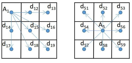 where Ai represents the accessibility of node i on the network; represents the minimum impedance between nodes i and j, which is expressed in time cost in this work. The accessibility of node i is the average of the minimum impedance of the node to all other nodes on the network (Figure 3). The disadvantage of this method is that it treats all destinations equally and does not take into account differences in travel purposes. However, our work is only aimed at measuring traffic convenience and does not consider travel purposes, so this method is applicable.