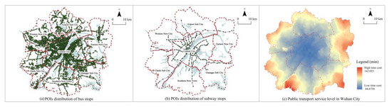 First, we crawled the bus and subway stations and routes of Wuhan City in 2021 (excluding the unbuilt and not yet in operation data, as shown in Figure 4a,b) in AMap (A provider of navigation and location services solutions in China (https://lbs.amap.com/, accessed on 11 November 2022)), then we built Wuhan City public transportation network by traffic network analysis of Arc GIS, and we constructed Wuhan PTSL with the average minimum time used by the center point of the previously described 500-m grid through the traffic network to the center points of all other grids in the research scope. Finally, the evaluation map of the PTSL in Wuhan is obtained through spatial interpolation. The longer average minimum time indicates the lower PTSL in the area, as shown in Figure 4c, which shows that the further the distance from the central city, the longer the time taken from the grid center to the center of the rest of the grid, and the worse the service level, which means that the PTSL in Wuhan City shows a decreasing trend from the central city to the suburbs as a whole.