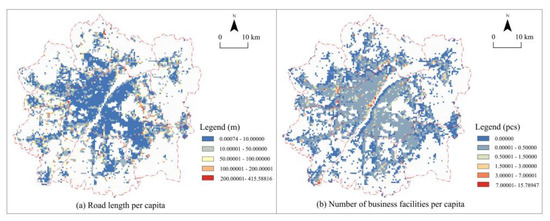 A 500 m × 500 m spatial grid unit is adopted, with the proportion of users within the grid as the dependent variable and the PTSL as the independent variable. At the same time, considering that the demand for ride-hailing will also be influenced by road density [39,40] and POIs [41,42], we include them as control variables in the model. Road density is expressed by the per capita road length in the grid (Figure 5a), and business facility POIs are expressed by the per capita number of four types of facility points: shopping, dining, rest and recreation, and living services in the grid (Figure 5b).