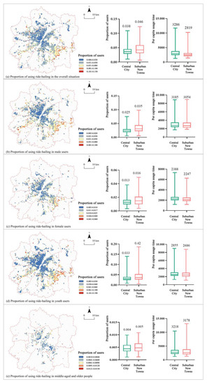 The changes in quantity and duration directly reflect the spatial heterogeneity characteristics of ride-hailing usage in Wuhan. Two indicators are used for statistics, one is the ratio of the number of people using ride-hailing apps within the grid to the total number of people living in the grid (Proportion of users), and the other is the average usage time of the total number of people using ride-hailing apps within the grid (Per capita usage time), which measures the ride-hailing usage in the central area and suburban new towns of Wuhan. We divided the research objects into five situations of the overall situation (regardless of gender and age), male and female, youth and middle-aged and older people to conduct a comparative study between the central city and suburban new town, to discover spatial differences and population preferences in the use of ride-hailing and further argue for the differential impact of the relationship between ride-hailing and PTS. Based on the classification of age groups by the WHO and the data recorded by China Unicom, we divided the age group between 18 and 44 years old into young people and the age group above 44 years old into middle-aged and elderly people. Since elderly people rarely use mobile phones, we conducted a combined analysis with middle-aged people.