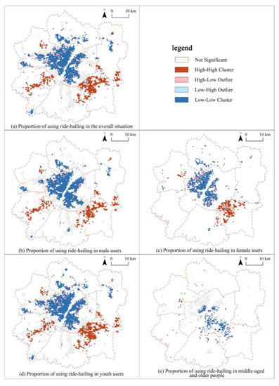 Figure 7 shows the LMI results for the five categories of cases. In terms of the overall situation, H-H indicates that the proportion of users in this spatial unit is relatively high, and the surrounding areas are also relatively high. This type of area is widely distributed in the suburbs of Wuhan City, with the Guanggu Sub-City and Chedu Sub-City being the most prominent. The southern part of the central city close to the Chedu Sub-City also has obvious characteristics, which may be because although the area belongs to the central city in terms of administrative division, from the current situation of transportation development in Wuhan, the area has been divided into suburban areas. In addition, the southern part of the Eastern New City near the Guanggu Sub-City also shows H-H clustering. L-L means that the proportion of users in this spatial unit is relatively low, and the surrounding area is also relatively low. This type of ride-hailing is mainly distributed in the central city, as well as in the Western New Town and Airport Sub-City. L-H scattered distribution at the edge of suburban new towns, with no obvious clustering trend, and the H-L are opposite, scattered in the urban fringe of the central city.