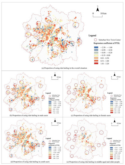 In the overall situation, the regression coefficient of PTSL is between −2.5 and 3.2, with both the average and median values being positive, and its impact is mainly positive. From the coefficient distribution results in Figure 8a, it can be seen that, in general, the impact of PTSL on the proportion of users is inconsistent between the suburban and central city, with mostly positive correlations in suburban areas and large differences in results in central urban areas. A positive correlation indicates that in suburban areas, the longer the time of using PTS, the higher the proportion of ride-hailing users, which means that the poorer the PTSL, the more residents tend to adopt ride-hailing for travel activities, and the ride-hailing complemented the PTS, thus improving transportation services in areas with poor PTS.