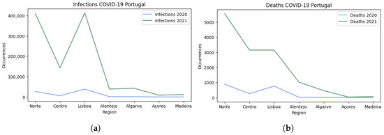 According to the Portuguese National Statistics Institute [30], the first deaths associated with the COVID-19 virus were registered in 2020. One year after the beginning of the pandemic, the number of deaths had increased, resulting in an excess of 1925 deaths on average monthly and a decrease of 4.8% of live births compared to the previous five years. Figure 1 shows the numbers registered in the regions of Portugal (Figure 2) in September 2020 (a) and September 2021 (b), presented by the Direção Geral de Saúde (DGS—Health Authority in Portugal). This institution launched a website with official and updated information on COVID-19 to inform citizens about the evolution of the virus.