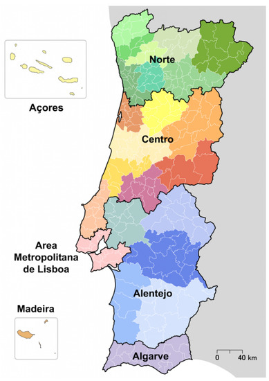 Regions of Portugal (from: https://www.nacionalidadeportuguesa.com.br/mapa-de-portugal/) (accessed on 10 March 2023).