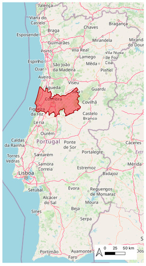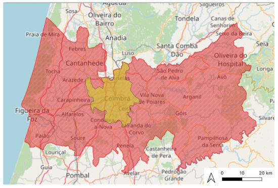 We considered Portugal the area of study, with specific attention to the District of Coimbra, which can be seen in Figure 3 and Figure 4. Coimbra is a district from the central region of Portugal with an area of 3974 km and, according to the 2021 Census [33], with 408,631 inhabitants. In terms of cities, its the largest city in the central region (Figure 4) with an area of 319 km and around 140,796 inhabitants. The data corresponds to anonymized CDRs that were generated by nearly 5000 individuals registered as residents in the city of Coimbra, throughout September and October of 2020 and in the same period of 2021. The individuals studied were randomly selected by the mobile operator.