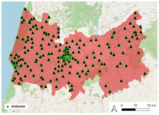 The telecommunication company owns more than 48,000 antennas in Portugal, 2093 of which are in the district of Coimbra. Figure 5 highlights the geographical distribution and density of antennas/cell towers in the district. It is observed that there are areas of higher density of antennas. To analyze the antennas’ distribution, a density-based clustering algorithm, the Density-Based Spatial Clustering of Applications with Noise (DBSCAN), was used to separate areas with a high density of antennas from areas of low density. This algorithm can recognize areas with elevated density of events, defining that two points are in the same cluster if the distance between them is below the threshold epsilon (eps) [34]. In addition, it is also capable of handling outliers.