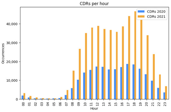 The datasets used in this analysis contain such information as the ID of the user that started the interaction, the ID of the antenna to which the user was connected when the event started, the time that the event started, and some information about the antenna. As presented in Figure 6, most of the CDRs were registered during the daytime both in 2020 and 2021. This study is related to weekday usage. In the September and October of 2020, 221,400 CDRs were generated by the studied population. Regarding 2021, 526,033 CDRs were registered.