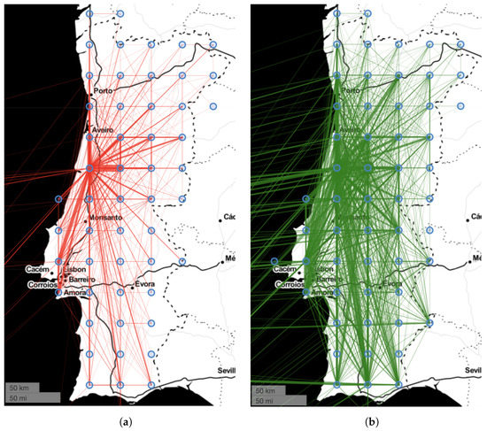 A CDR documents how users interact with the cellular network. These records are generated in large quantities as a by-product of the billing by mobile operators and usually contain such information fields as the origin and destination antenna ID, the ID of the user, the time that the event started, and the duration of the communication. It is also usual that some telecommunication companies attach to these datasets information about the user or the location of the antenna [35]. The geo-references presented in CDRs correspond to the locations of the antennas to which the individual’s phone is connected when interacting with the network to make/receive a phone call or SMS. Therefore, with this type of data, the location of the user is only known at an antenna level (obtaining an accurate location is impossible). Nevertheless, CDRs are a type of mobile phone data frequently adopted to study simultaneously individual movements and social interactions [36].