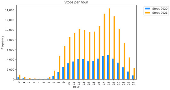 The analysis of the trajectories coincides with the observed in the maps from the flow dataframes (Figure 7). Although in both periods most of the events were registered in Coimbra, CDRs were registered in antennas all across the country. The original trajectory dataframe, containing the CDRs generated in 2020, contained 220,490 points. After the identification of stop locations, the points in the dataframe were reduced to 54,009. The 2021 original trajectory dataframe contained 525,978 points. With the pre-processing, 147,930 points were identified as stops. In 2020, each individual registered an average of 8.95 stops; in the same period of 2021, the average number of stops increased to 32.12 per user. However, besides the different number of stops in the two years, the quantity of stops is similar in both periods in terms of hours. As is observable in Figure 8, just like in the CDRs, the number of stops rise at 7 a.m. with a slight difference that in 2020 stops during the early morning were more frequent. Then, the frequency stays at a high level until 7 p.m., before dropping and reaching a low between 1 a.m. and 5 a.m.
