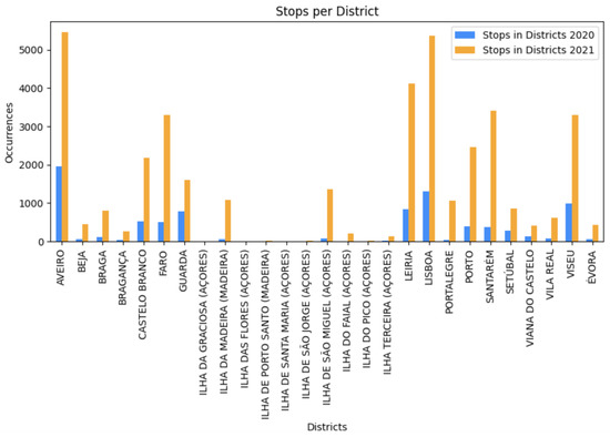 Coimbra was, with distinction, the most visited district in both years, with more than 40,000 stops registered in 2020 and 100,000 in 2021, an increase of 150%. We concluded that, in relation to the total number of stops, 74% of the stops were registered in this district in 2020 and 67% in 2021. So, besides the augmentation of stops in Coimbra in 2021, the percentage of stops in 2021 was lower compared with the previous year. To compare the visits in the other districts, the graph in Figure 9 calls attention to the difference in the visits in the rest of the districts of Portugal.