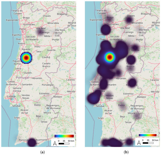 After applying the density-based clustering algorithm, 17 clusters were found in 2020 and 281 in 2021. The heatmaps in Figure 12 were also generated in QGIS, and represent the clusters found. In the heatmaps, significant clusters are illustrated. These maps were created based on the weight of the clusters, which means that regions where more clusters were found are more highlighted (have a brighter color). As observed, in the first year, most of the locations visited were in Coimbra, with some exceptions, for example, visits to the south of Portugal. In the following year, even with the extreme number of infections and deaths, according to DGS [31], especially in the region of Lisbon and the northern region of Portugal (Figure 1), the individuals traveled and visited almost all districts across the country.