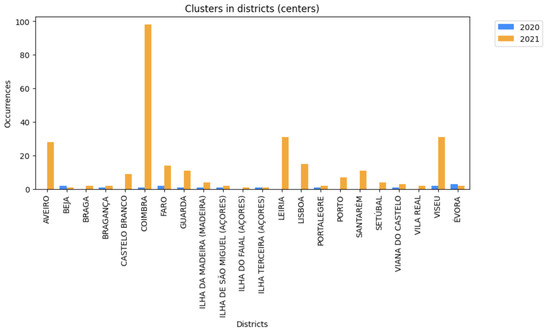 As observed, more clusters were found in 2021, indicating that people visited more locations in 2021, even though in September and October of 2020 most of the contingency measures were already dropped. A cluster can comprise stops from more than one district. The graph in Figure 15 shows the districts where centers of clusters were found. These conclusions were taken after the identification of the antenna that was closest to the centroid of the clusters. Contrary to 2020, where some of the districts were not associated with a cluster’s center, in 2021, in most of the districts, at least one center of a cluster was identified. This graph highlights the differences observed in the heatmaps presented in Figure 12, Figure 13 and Figure 14, giving knowledge about the enlargement in visits in 2021 and proving that in this year more islands of the Azores were visited.