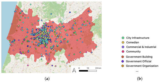 The crowdsourced dataset used in this analysis, containing the Facebook POIs, had already been constructed for the whole country in previous work [22]. This allowed access to an extensive offline database. The POIs in this dataset are used for land use classification. The dataset contains such data as the name of the place, the number of “check-ins” in that location, the opening time, the geo-location (latitude and longitude), category to which the POI belongs (e.g., Portuguese Restaurant, Wholesale and Supply Store, etc.), the city where the POI is located and the top category to which the POI belongs (e.g., Food and Beverage, Shopping and Retail, etc.).