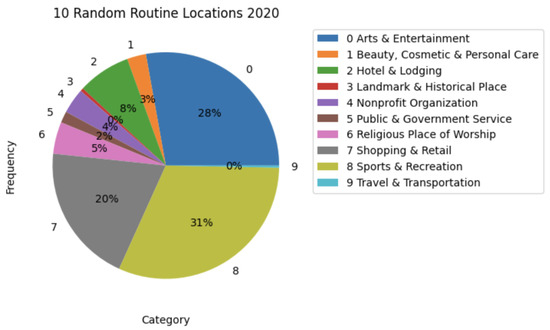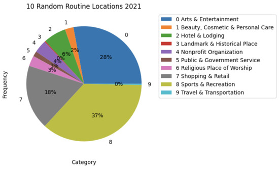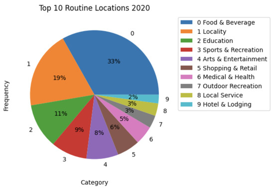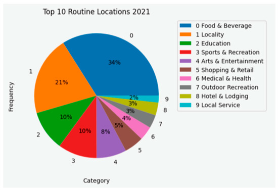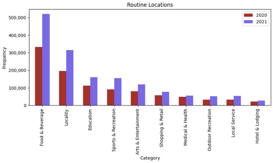 In 2020 the most visited category was related to Food and Beverage and the least visited was associated with Writing. In 2021 Food and Beverage was also the most visited category. Also, in 2021, activities associated with Media/News Company were the least popular in terms of visits. The analysis shows that the top 10 categories with more visits were similar in both years. Figure 18 presents the 10 categories that were, most of the time, associated with the routine locations identified. As is observed, in Figure 19, the preferences in routine locations were maintained.