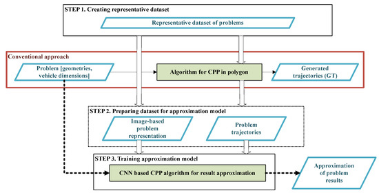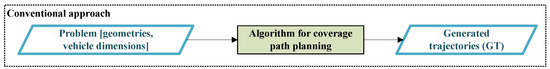 The conventional CPP approach is straightforward. Based on the initial data, such as geometry, vehicle dimensions, and other restrictions, an algorithm to generate the coverage path is designed and the final output is the generated trajectories for the given problem. The scheme for the conventional CPP approach is provided in Figure 1.