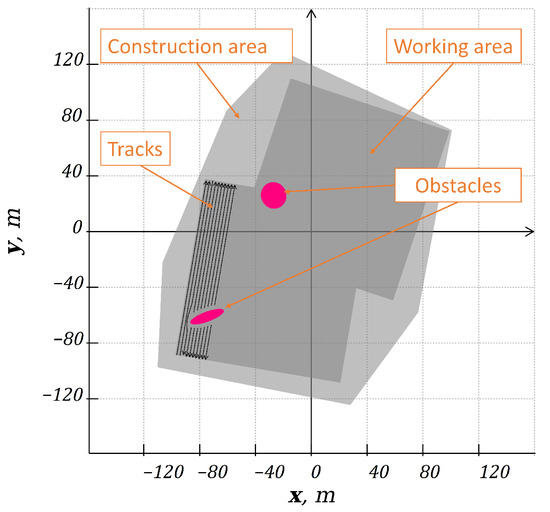 The CPP problem is focused on finding a set of tracks that cover the area of interest. The surface of the three-dimensional (3D) terrain is considered in agriculture. However, parking lots are usually installed in flat areas, so the two-dimensional (2D) area is considered. The region where paving needs to be applied is called a working area. The region in which the construction vehicle can move is called the construction area. The working area is inside the construction area. In some cases, it is possible that the boundaries of the construction area and working area coincide. For example, if the working area is surrounded by a wall, the construction vehicle cannot move outside it. A construction vehicle moves in tracks. The track is not necessarily a straight line, but it consists of straight lines (segments). Finding an optimal order of tracks is a different type of optimization problem not considered in this research. Obstacles are the areas inside the region of interest which must not be covered, and it is considered that the construction vehicle cannot even move in the obstacle area. The definitions are illustrated in Figure 3.