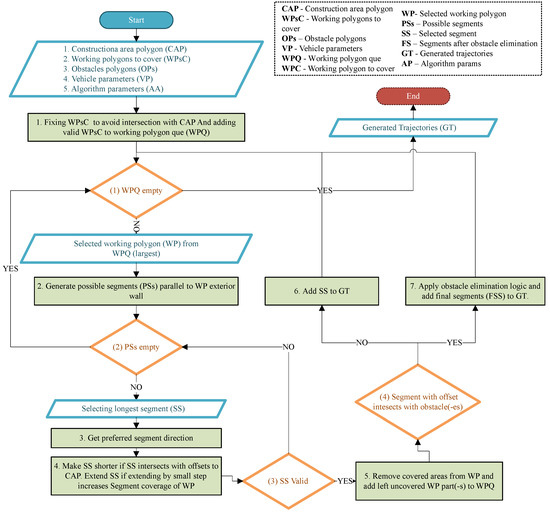 The suggested CPP algorithm is based on the idea that the tracks should be aligned with one of the boundaries of the working polygon. The algorithm input consists of the geometry of the working and construction polygons, vehicle parameters, and algorithm parameters. Vehicle parameters, such as turning radius, width, and length, limit the curvature of the track and define the track discretization level. The number of approximation nodes in boundary noise reduction, the minimum allowed length of the track, the discretization step, and other parameters related to algorithm performance are defined as algorithm parameters. However, by taking into account that only the CPP algorithm itself is the object of this research and that algorithm parameters can be adjusted to meet the problem aim, the CPP algorithm steps are provided without the analysis of different parameter configurations. The flow diagram of the algorithm for the CPP in polygon is provided in Figure 4.