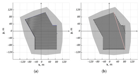 The proposed CPP algorithm (Section 2.3) uses a heuristic approach to select the longest possible segment generated of possible segments with respect to the exterior wall of the working polygon (WP). However, based on the problem objective, such an approach may not lead to the optimal solution. In this research we will examine a simplified case (Case 1) in detail. In this case, the decomposition approach and the objective function are straightforward. The objective is to cover an area with the lowest possible number of tracks. An example of how track number differs based on the initial decomposition is provided in Figure 5. If the longest track is selected out of possible boundary tracks as a reference track, the resulting number of tracks is 93 (Figure 5a). In comparison, if the reference track is selected using an expert’s knowledge or is based on a different algorithm, the number of tracks is 79 (Figure 5b). This example illustrates the fact that decomposition should be performed with consideration of the construction area geometry.