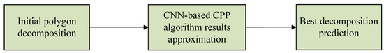 In order to find the optimal decomposition which results in the minimum number of tracks, all possible decompositions must be considered. However, the CPP algorithm is a time-consuming process and considering all possible decompositions is not practically acceptable. In this case, an approximator of the CPP algorithm results may be used to predict the number of tracks for the decomposed parts and therefore the whole geometry. The CNN-based approximator application schema is provided in Figure 6.