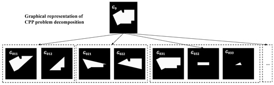 where is the number of tracks for the lth part in the jth set of geometries with initial ith geometry. The sum is augmented by 1 as the geometries are generated by subtracting the polygon covered by the reference track. The decomposition algorithm provided for Case 1 dataset generation can be directly applied in this case. An example of the initial problem decomposition, if splitting is performed based on possible segments formatted parallel to the SP exterior wall extension and its node connection, is provided in Figure 7.