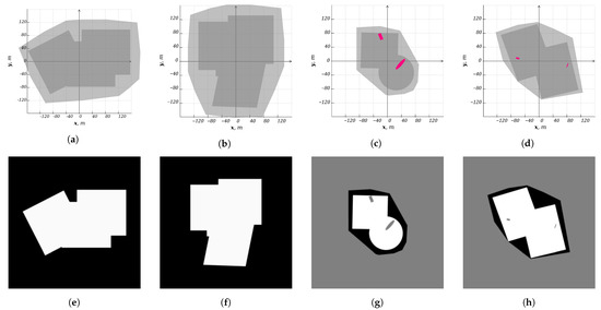 The examples of the samples generated in order to represent cases in which the construction vehicle can freely move out of the working area to the construction area (a,b) and cases in which the motion of the construction vehicle is restricted by the boundaries of the construction area (c,d) and their image representations (e–h), respectively.