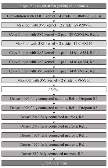 CNN models are mainly applied to analyze images in the form of multi-dimensional matrices. To evaluate the geometry of the working and construction areas using the CNN model, they were represented as a square grayscale image. The architecture of the CNN model was based on the AlexNet architecture [28]. Compared to the recently developed architectures, AlexNet is a light CNN model that demonstrates high performance. The input size of AlexNet (224 × 224 × 3 pixels) was changed to 250 × 250 × 1 pixels to fit the dimensions of the input image. The number of channels was reduced from three, relevant to RGB images, to one, since a grayscale image was analyzed and one channel is enough to describe the geometry classes, such as working area, construction area, obstacles, and background. Thus, the number of trainable parameters changed accordingly. The model has five convolutional layers, with max pooling layers after the first, second, and fifth convolutional layers. The convolutional layers are followed by two fully connected layers, with a dropout layer after each of them and five fully connected layers. To apply the CNN model to the regression problem, the output layer consists of three numbers, which represent an average of track lengths, its standard deviation, and total tracks for the analyzed geometry. The architecture of the CNN used in the regression model is provided in Figure 9 with parameters defined for each layer.