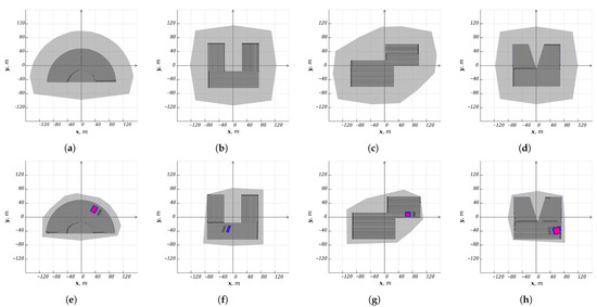 The CPP results for shapes from the benchmark dataset with large construction area (a–d) and narrow construction area (e–h).