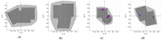 The CPP results are demonstrated for the datasets with distinct characteristics. Firstly, the CPP results were shown for the selected samples from the benchmark dataset [6]. The same examples have been analyzed with the condition that the construction area is large enough for the construction vehicle to fully leave the working area and with the condition that the construction area may disturb the vehicle’s motion, including randomly rotated obstacles of rectangular or ellipsoidal form (Figure 10).