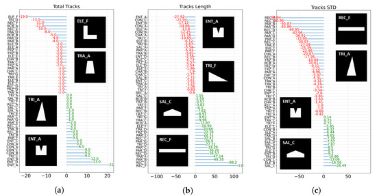 The differences in total tracks (a), length of tracks (b), and standard deviation of tracks (c).