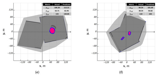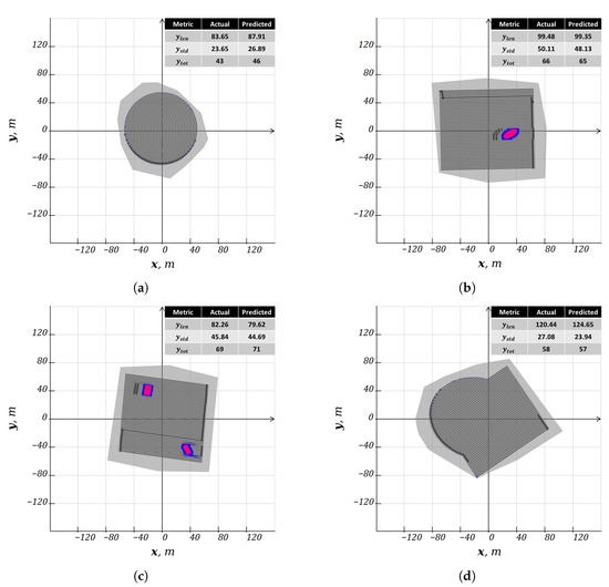 The results demonstrate that using the LR approach has been outperformed by the CNN-based approximation model. The better results obtained using approximation mean that even for complex cases, the model evaluates the relationship between the shape of the working area and the predicted results. Examples of all configurations with actual values and values predicted by the approximation model are provided in Figure 14.