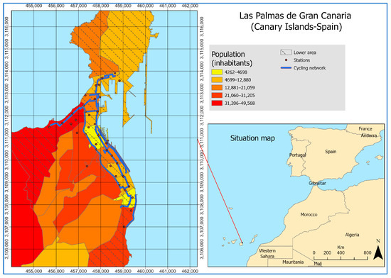 The city of Las Palmas de Gran Canaria is located on the island of Gran Canaria, one of the eight islands that make up the Canary Archipelago in the Atlantic, near the West African coast (see Figure 1). This situation, together with the trade winds, promotes average temperatures of 20.7 °C per year, with mild winters and summers. In addition, it receives less than 300 mm of rain a year and many sunny days. Las Palmas de Gran Canaria had a population of 378,517 inhabitants in 2018, whose distribution by postal code is shown in Figure 1.