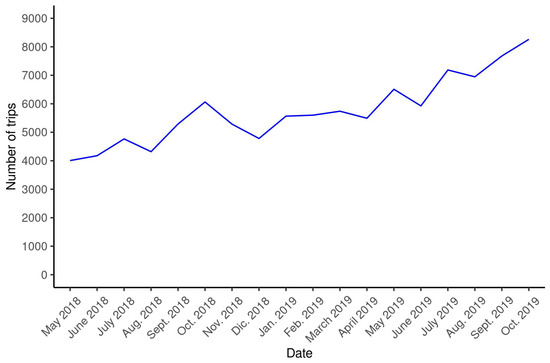 The trips on the shared bicycle network have increased over time. Specifically, when considering the group of interest, that is to say, local users with different rental and return stations, we can see in Figure 2 that it has increased steadily over time, and no significant seasonal effect with respect to monthly periodicity can be observed.